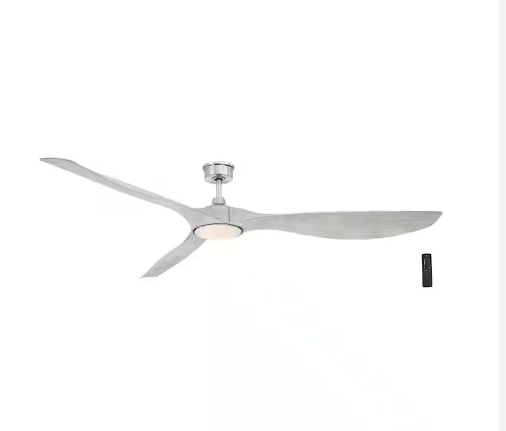 The HDC Marlon 84 in. Ceiling Fan offers a striking brushed nickel finish and large 84-inch blades in light gray, perfect for expansive indoor spaces. Equipped with integrated LED lighting, it provides bright and energy-efficient illumination. The included remote control allows for easy adjustment of fan speeds and lighting settings. This ceiling fan combines modern aesthetics with practical functionality, delivering robust airflow and sleek design to enhance the comfort and style of your large rooms.